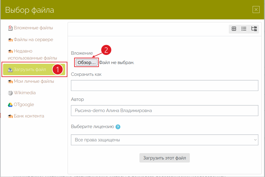 - Выбрать хранилище «Загрузить файл» (поз. 1 Рис. 2) и нажать на «Обзор» (поз. 2 Рис. 2)