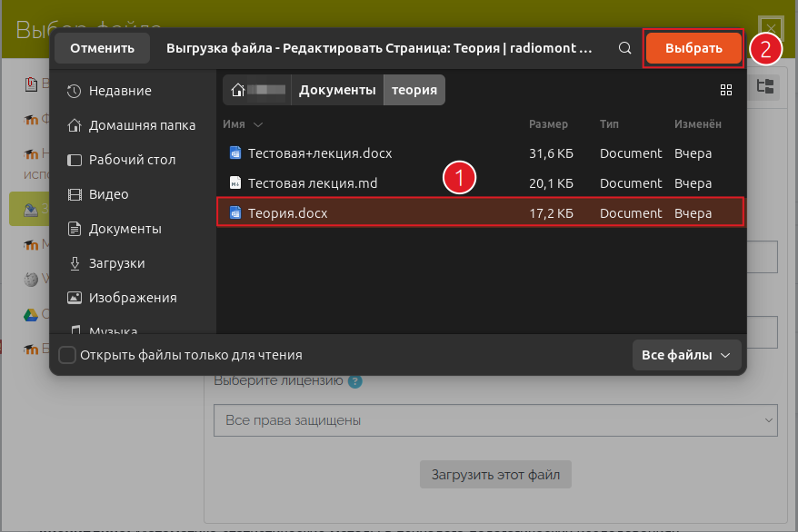 - Выбрать нужный файл (поз. 1 Рис. 3) и нажать «Выбрать» (поз. 2. Рис. 3)