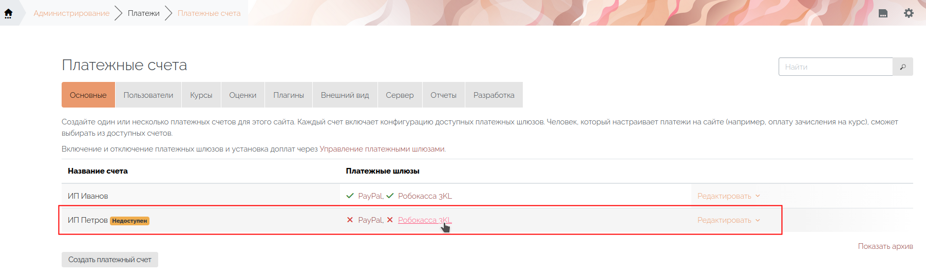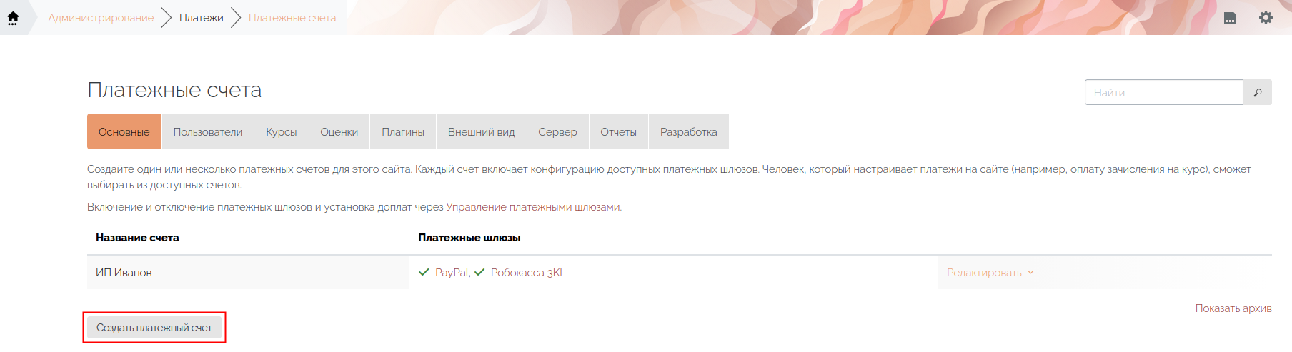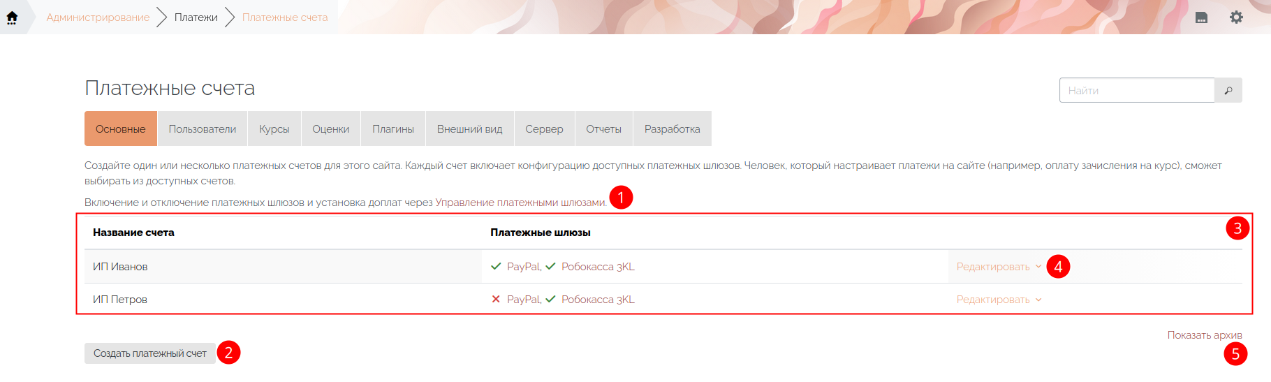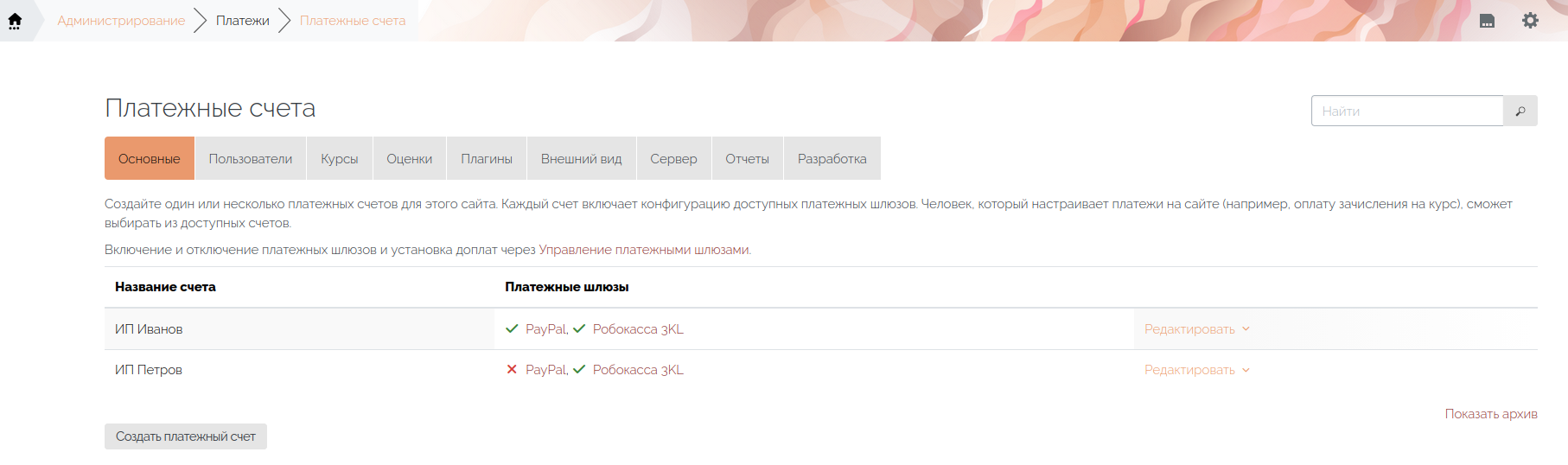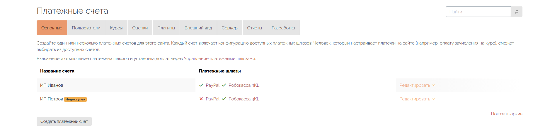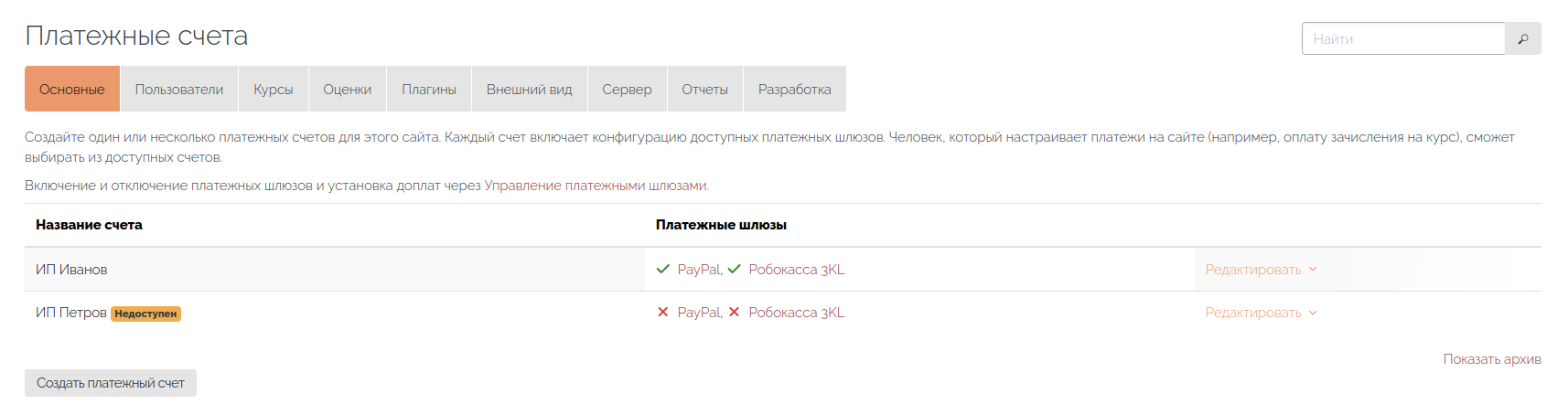 Функционал платежных счетов предоставляет пользователям возможность совершать платежи через настроенные в системе платежные шлюзы (специальные плагины банков, платежных систем или сервисов) и используется, в первую очередь, для платных способов зачисления на курсы.