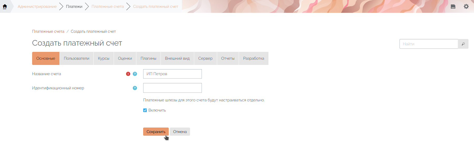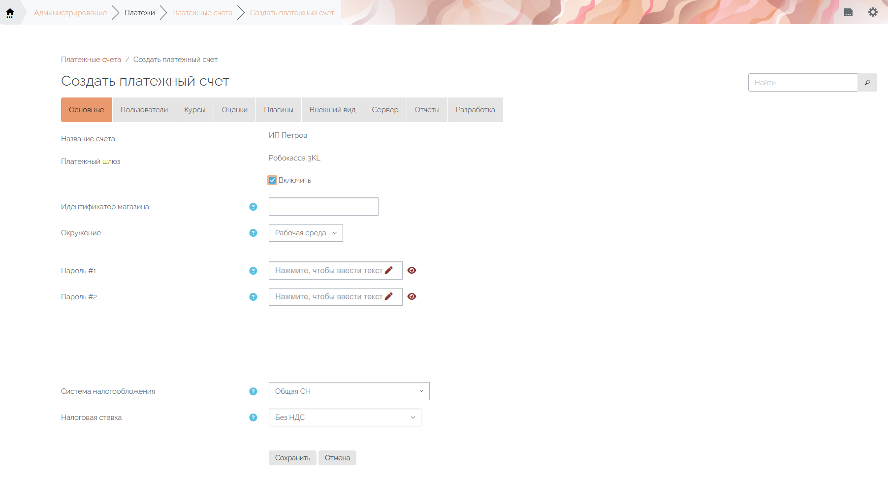 - Название счета. Название, которое будет отображаться для этого платежного счета в интерфейсах системы (например, то, что будет видеть преподаватель при настройке платного зачисления на курс и выборе оплаты через платежный шлюз).