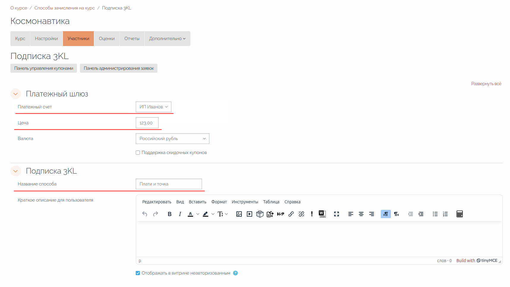 1) Преподаватель настраивает платное зачисление на курс: добавляет способ зачисления «Подписка 3KL» (Рис. 2.2.1), указывает в нем способ оплаты «Платежный шлюз» (Рис. 2.2.2), выбирает нужный платежный счет, задает стоимость подписки и название для способа зачисления (Рис. 2.2.3).