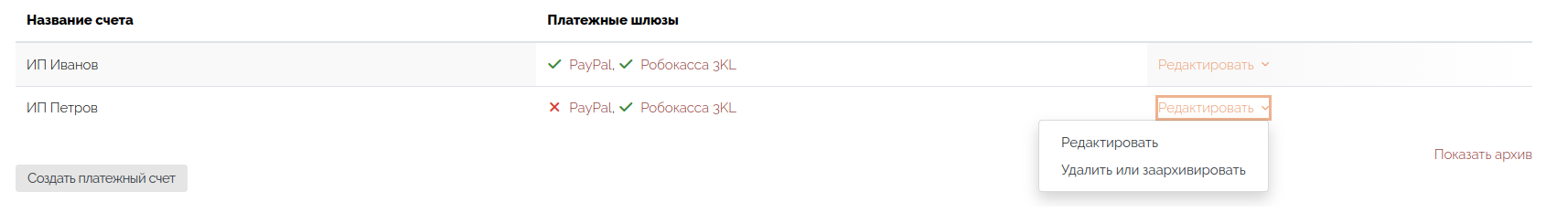 - Удалить или заархивировать - удалить платежный счет, если он еще ни разу не использовался (не было совершено ни одного платежа) или убрать счет из числа доступных пользователю (заархивировать), если по счету уже были оплаты.