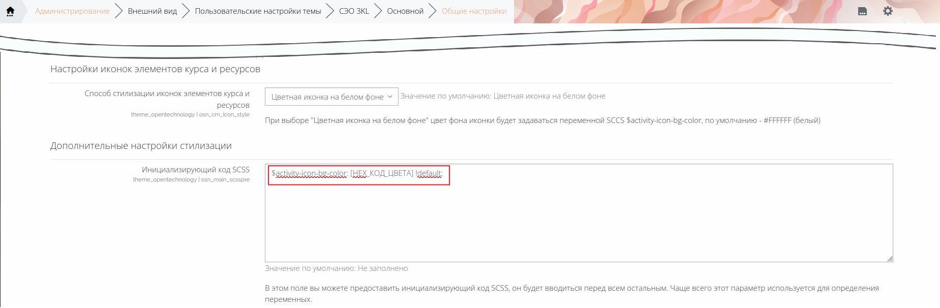 Настройка инициализирующего кода SCSS позволяет задать цвет фона для иконок элементов курса для способа стилизации иконок «Цветная иконка на белом фоне». Эту настройку можно выполнить по следующему пути: Администрирование->Внешний вид->Темы->СЭО 3KL->Нужный профиль->Общие настройки.