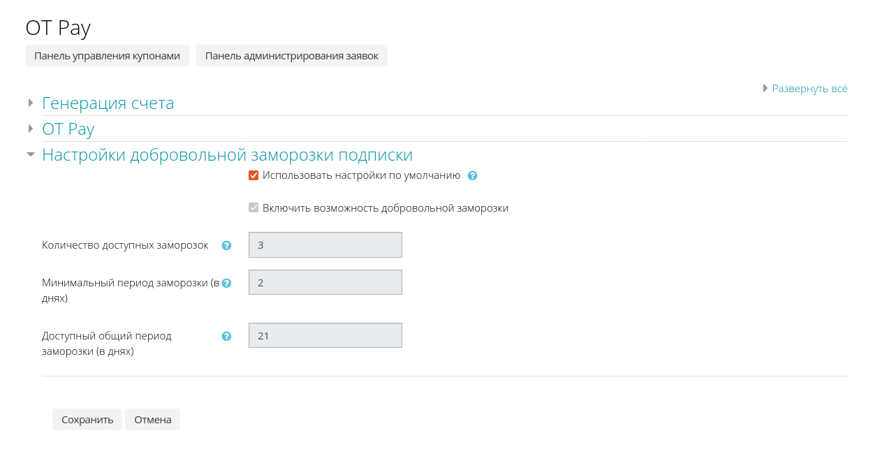 Новая функция для плагина OT Pay: добровольная заморозка подписки на курс. В настройках можно установить допустимое количество заморозок и максимальный срок заморозки в днях. #3487
