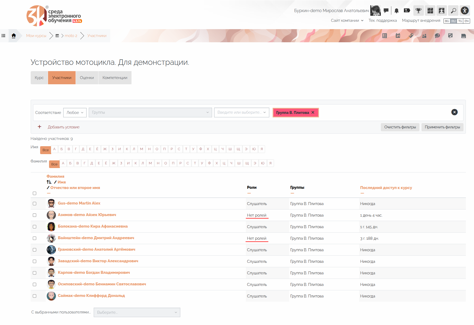 Рис. 1. Пример страницы участников курса, в котором присутствуют пользователи, чьи роли не видны.