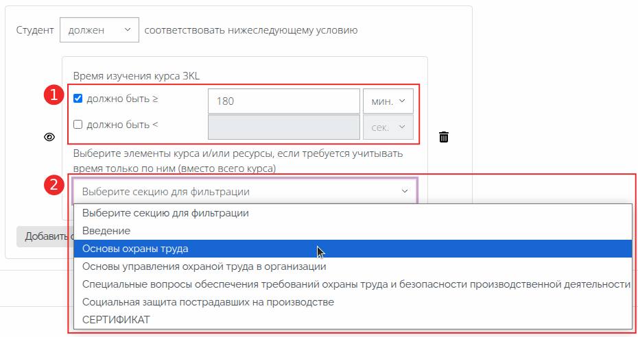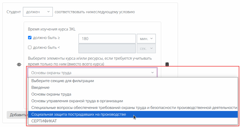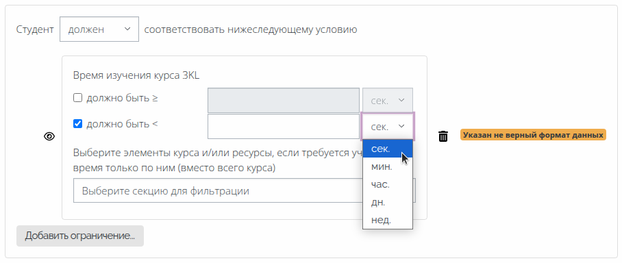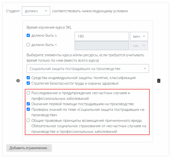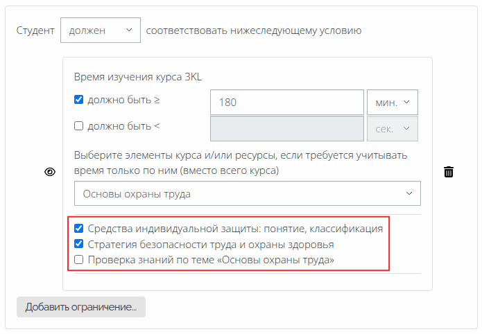 Помимо выбранных элементов и ресурсов курса в описании ограничения также отображается время, затраченное на изучение этих элементов и ресурсов.