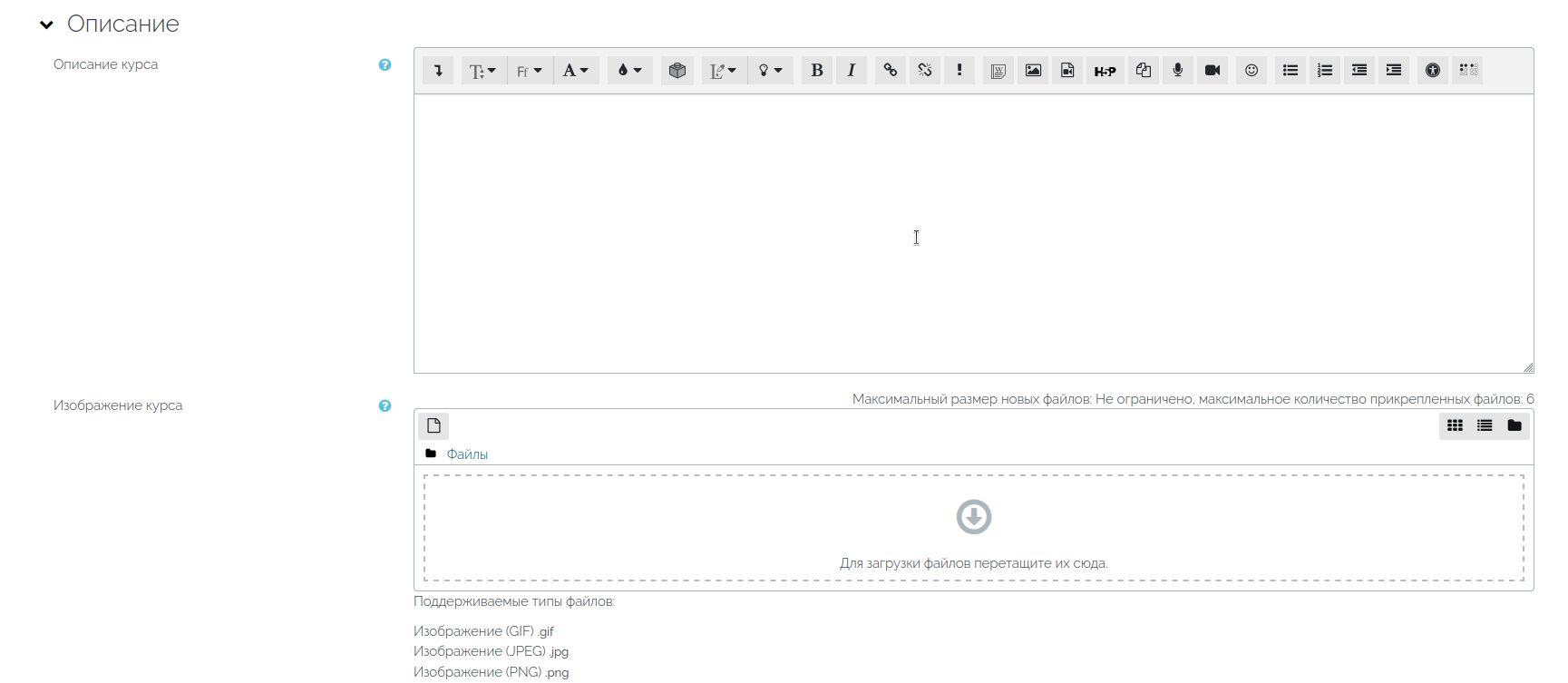 Изображение курса. Файлы описания курса (например, изображения) отображаются в списке курсов рядом с описанием. В эту область можно загрузить файлы перетаскиванием либо обычным способом, через указание пути. По умолчанию это – графические файлы .jpg, .gif, .png. Допустимые расширения файлов описания курса и их максимальное прикрепленное количество можно изменить, перейдя через меню Администрирование -> Внешний вид -> Курсы.
