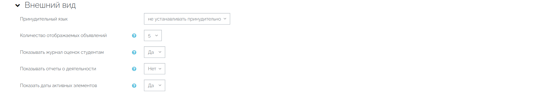 Показывать даты активных элементов – Нет / Да. Этот параметр определяет, показывать ли на странице курса даты, ограничивающие сроки выполнения или доступа к элементам курса. Даты задаются в настройках элемента курса.