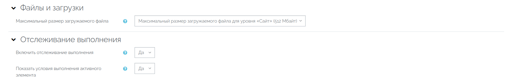 Включить отслеживание выполнения (см. Рис. 3.6.1) – Да / Нет. При включенном параметре условия завершения элемента курса могут быть заданы как в его настройках, так и в настройках условий завершения курса. Например, выставляются отметки об успешном выполнении после выполнения заданий в курсе.