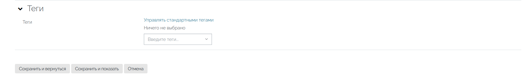 Теги (см. Рис. 3.9.1), в случае необходимости, можно выбрать стандартные из списка, либо ввести новые через текстовую ссылку «Управлять стандартными тегами» (управление стандартными тегами не доступно преподавателям курса и доступно только пользователям, обладающим правом moodle/tag:manage).