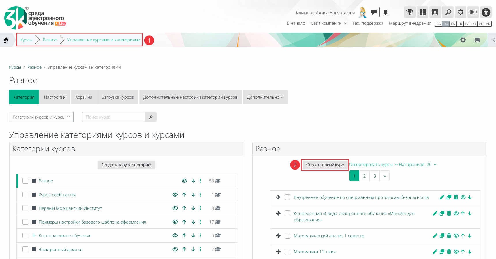 На этой странице удобно добавлять курсы, если требуется наглядное представление всех имеющихся в СЭО 3KL категорий курсов. Страница расположена по пути: Администрирование -> Курсы -> Управление курсами и категориями (поз. 1 Рис. 2.1.1), она позволяет открыть нужную категорию и добавлять в нее курсы.