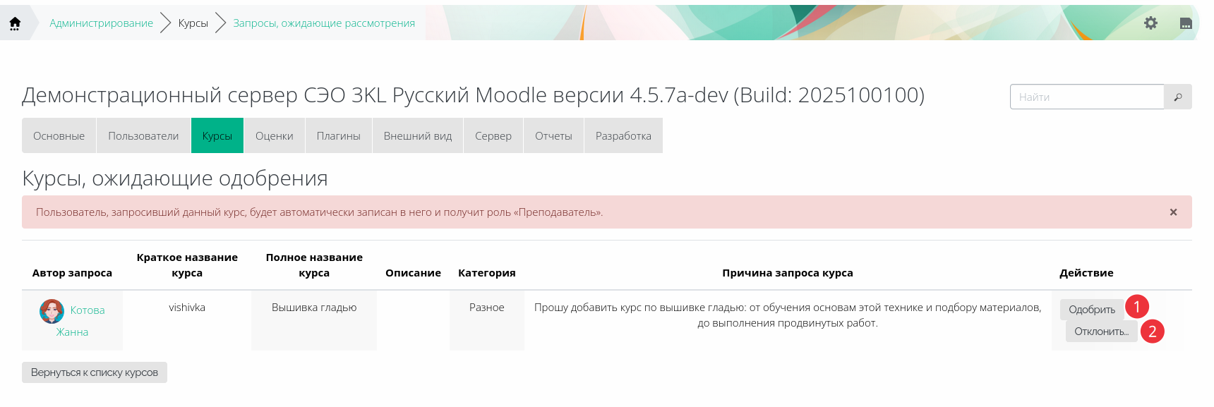 Администратор может либо одобрить запрос на создание курса (см. поз. 1 Рис. 2.7.4), тогда ему откроется страница создания курса, на которую будут перенесены настройки курса, заданные пользователем. Либо отклонить запрос на создание курса (см. поз. 2 Рис. 2.7.4), тогда запрос просто будет удален из списка.