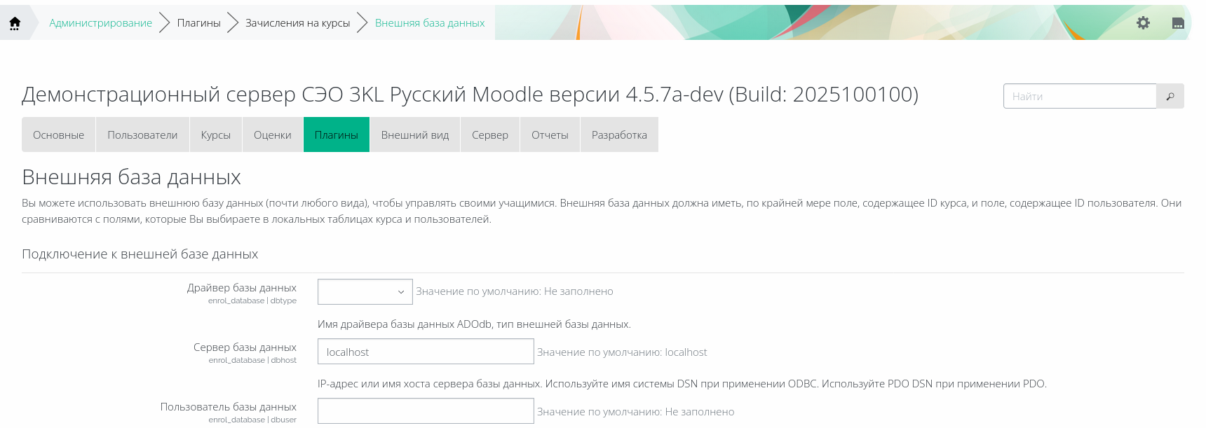 Настройка зачисления «Внешняя база данных» выполняется на странице Администирование -> Плагины -> Зачисления на курсы -> Внешняя база данных (Рис. 2.8.1).