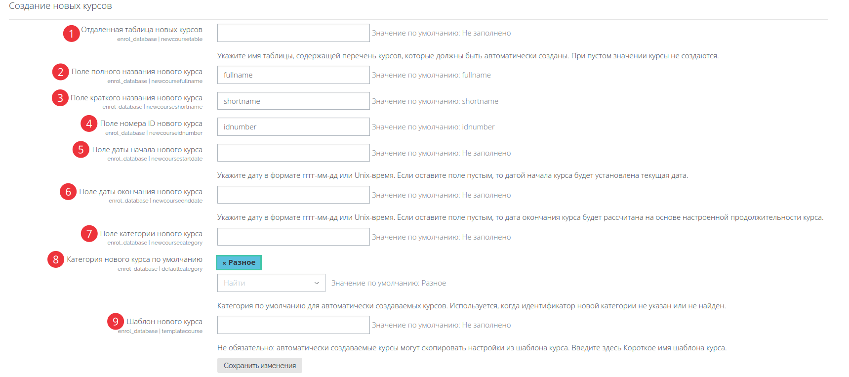 - Поле полного названия нового курса, Поле краткого названия нового курса, Поле номера ID нового курса, Поле даты начала нового курса, Поле даты окончания нового курса, Поле категории нового курса (см. поз. 2-7 Рис. 2.8.2). В настройках необходимо ввести названия полей из таблицы для создания новых курсов.