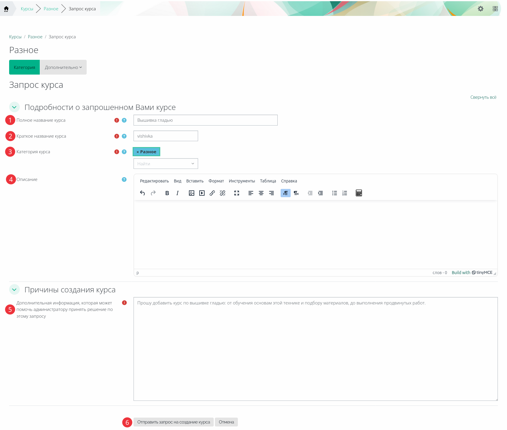 - Дополнительная информация, которая может помочь администратору принять решение по этому запросу (см. поз. 5 Рис. 2.7.3). В поле настройки пользователь обязательно должен указать обоснование причин, по которым он считает необходимым добавление курса.