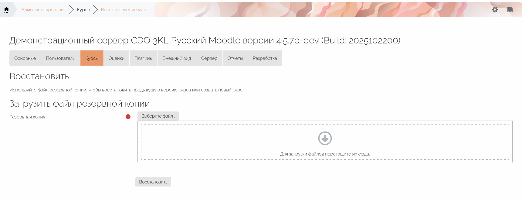 Чтобы восстановить курс из резервной копии, достаточно загрузить ее файл на странице: Администрирование -> Курсы -> Восстановление курса (Рис. 2.6.1). Файл в формате mbz необходимо загрузить в настройке «Резервная копия», запустить восстановление, и из загруженного файла будет либо создан новый курс, либо будет обновлен уже имеющийся курс.