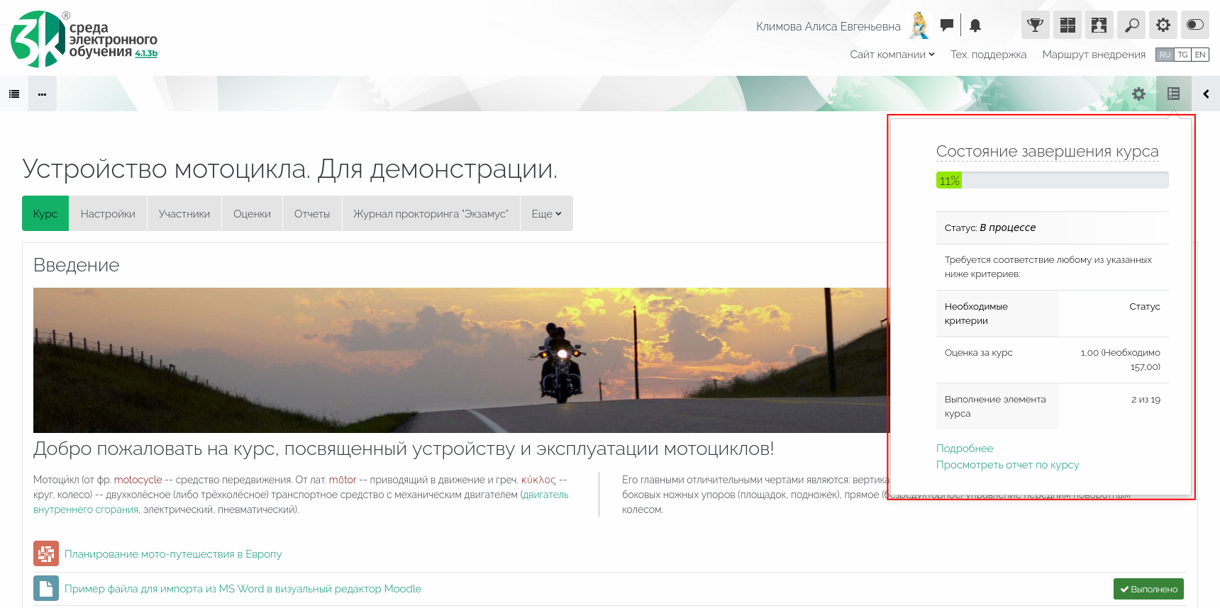 • в интерфейс блока «Состояние завершения курса» добавлен прогресс-бар, отображающий состояние прохождения курса пользователем;