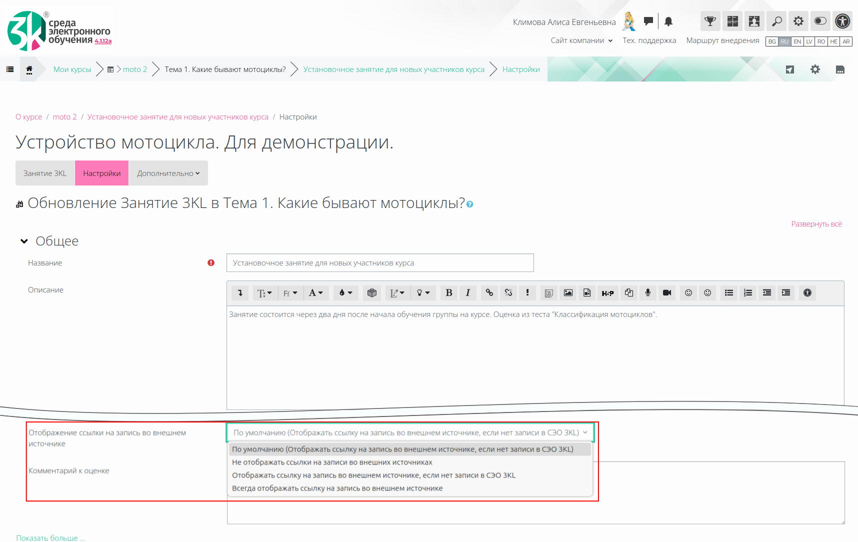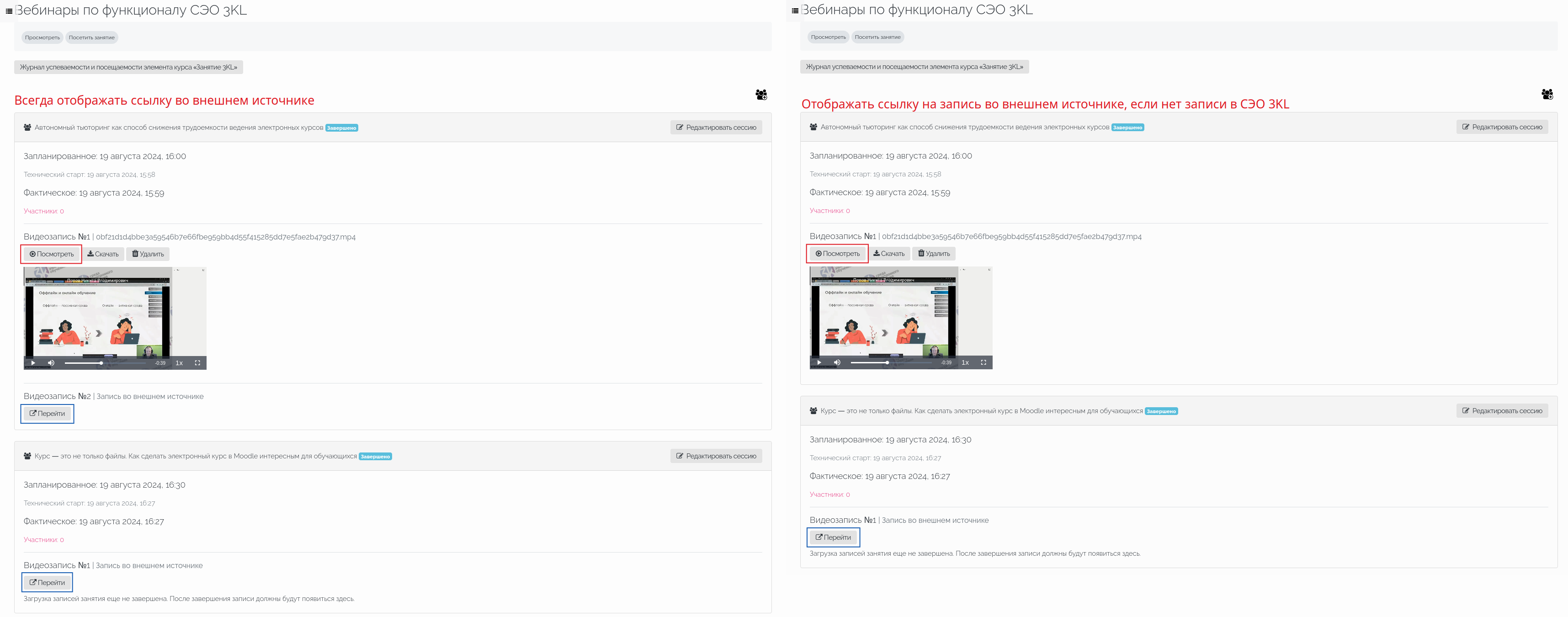 В элементе курса «Занятие 3KL» добавилась возможность настроить отображение ссылок на запись во внешнем источнике (провайдере вебинара). Ссылки могут отображаться всегда / никогда / при отсутствии загруженной в СЭО 3KL записи.