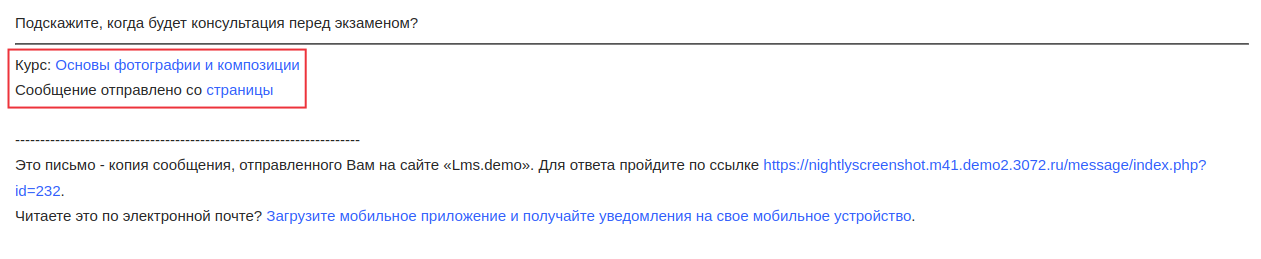 В уведомлениях, рассылаемых на почту из блока «Спросить преподавателя», теперь может содержаться ссылка на страницу курса, с которой поступил вопрос.
