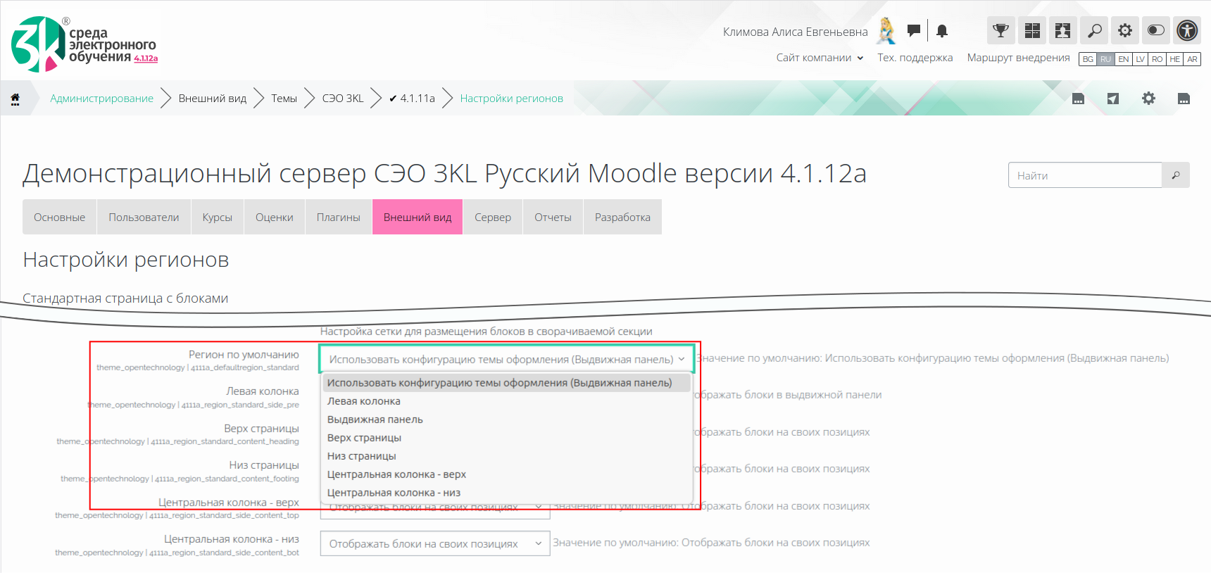 В теме оформления «СЭО 3KL» добавлена настройка «Регион по умолчанию». Настройка доступна для различных типов страниц, определенных в настройках регионов, и позволяет выбрать, в какой регион по умолчанию будут добавляться новые блоки на странице. #6445
