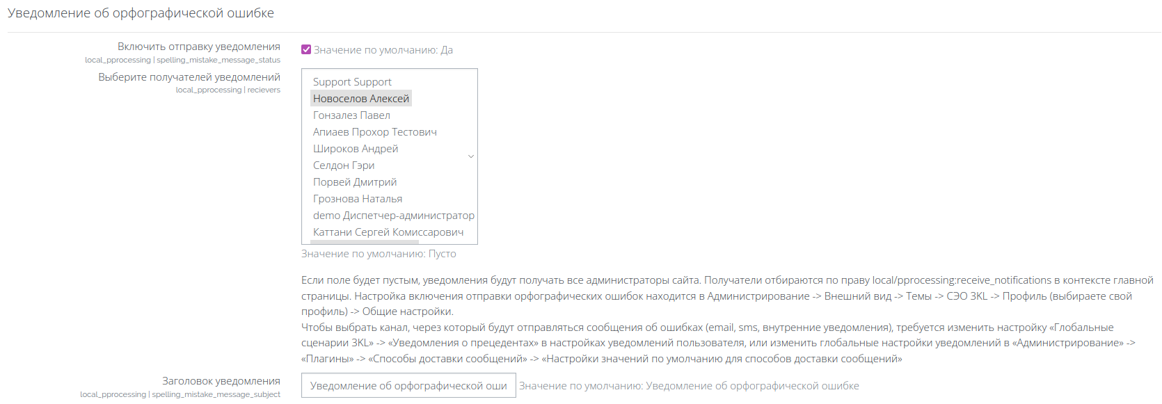 Получатели отбираются по праву local/pprocessing:receive_notifications (Право получать уведомления) в контексте главной страницы. Настройка включения отправки орфографических ошибок находится в Администрирование—>Внешний вид—>Пользовательские настройки темы—>СЭО 3KL—>Профиль(выбираете свой профиль темы)—>Общие настройки.