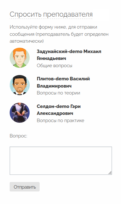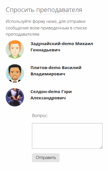 Блок содержит список контактов курса, которым слушатель может отправить сообщение, и поле для ввода текста вопроса преподавателю.