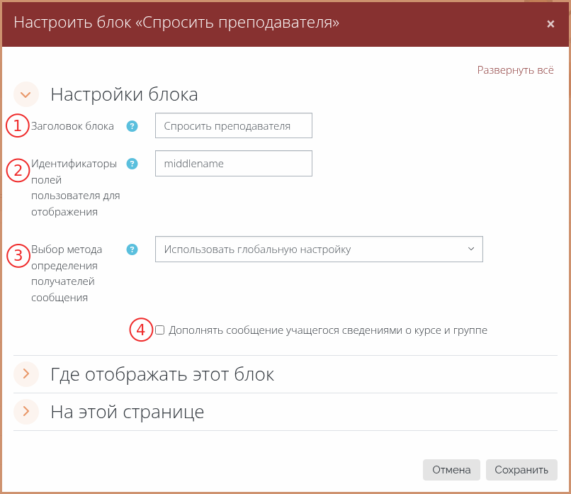 • Заголовок блока (см. поз. 1 Рис. 4.1). Позволяет переопределить название для экземпляра блока. Если поле не заполнено — по умолчанию блок будет называться «Спросить преподавателя 3KL».