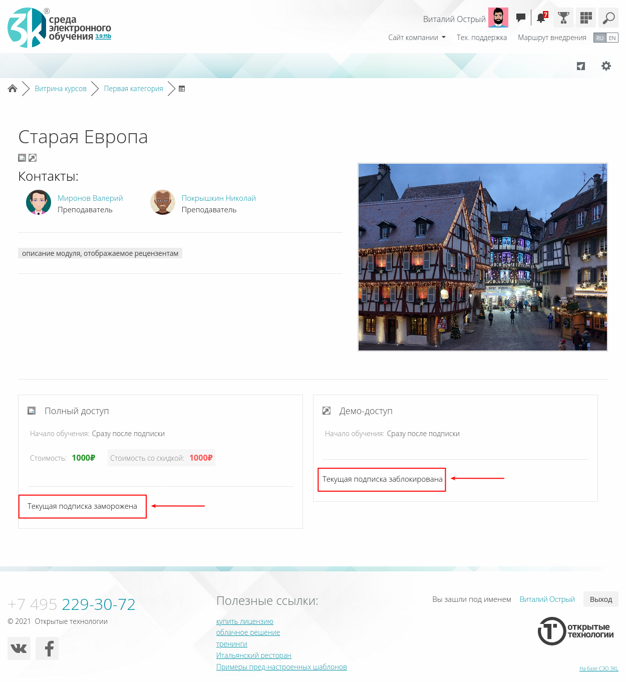Администратор системы предоставил пользователю демо-доступ к онлайн-курсу «Лидерство сроком» на 14 дней. Через 3 дня пользователь по акции приобрел платную подписку на тот же курс, которая сразу стала активна. Чтобы полноценно использовать обе подписки, пользователь включил добровольную заморозку платной подписки сроком на 11 дней. На странице описания курса в Витрине курсов в подписке "Демо-доступ" отображается кнопка «Войти на курс», а в платной подписке статус «Текущая подписка заморожена».