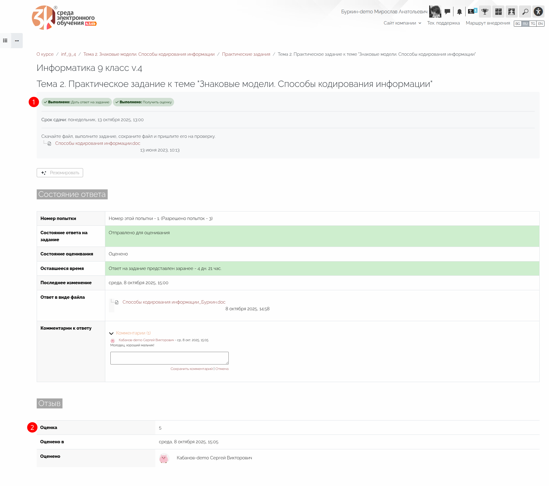 Результатом успешного прохождения Задания для слушателя будут достигнутые условия выполнения элемента курса (поз. 1 Рис. 3.5.1) и оценка за ответ, выставленная преподавателем (поз. 2 Рис. 3.5.1).
