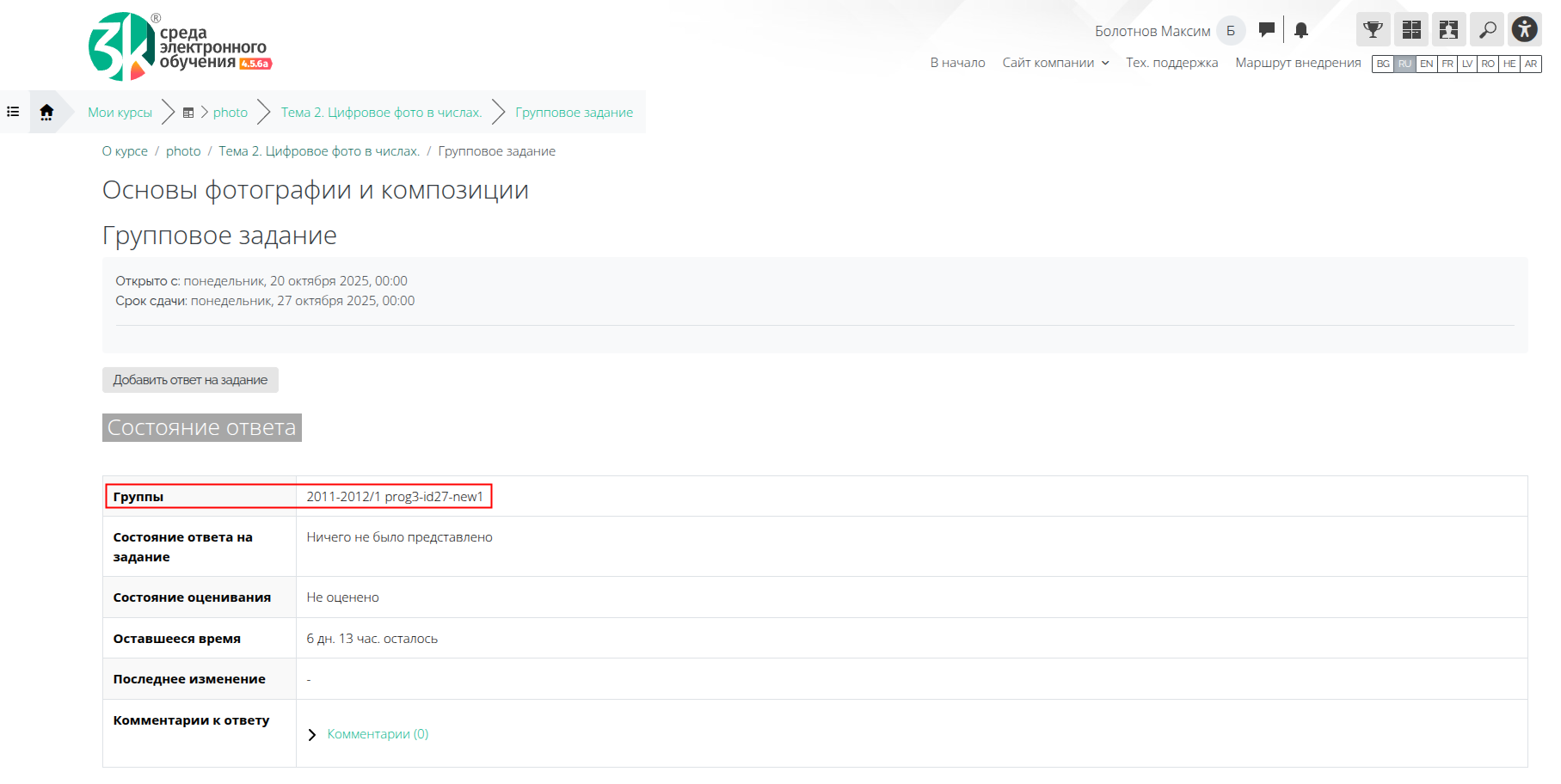Преподавателем может быть настроено групповое выполнение Задания — когда несколько слушателей (например, участники локальной группы курса или потока) формируют единый ответ на задание.  В разделе «Состояние ответа» интерфейса группового задания будет отображаться название группы, к которой принадлежит этот слушатель (Рис. 4.1).