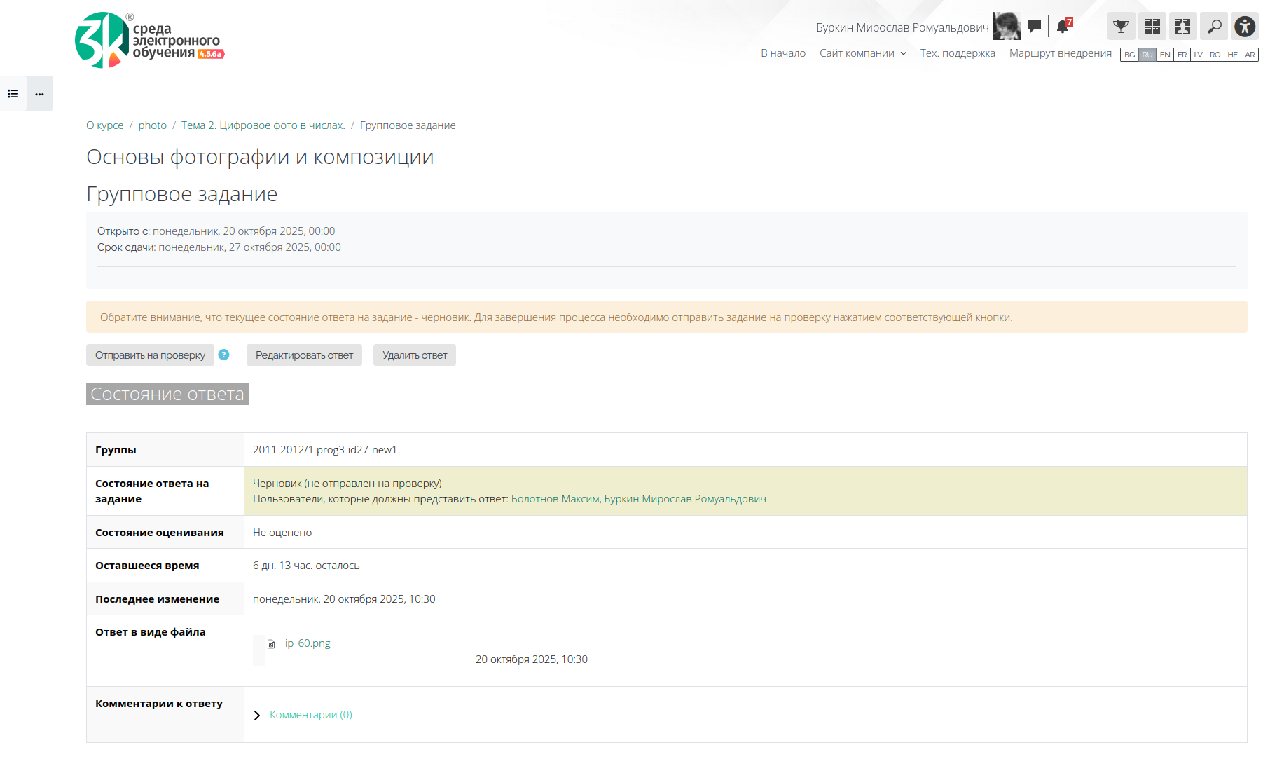 Рис. 4.4. Пример Задания с созданным черновиком группового ответа. Для отправки ответа на проверку нажать кнопку «Отправить на проверку» должны все участники группы.