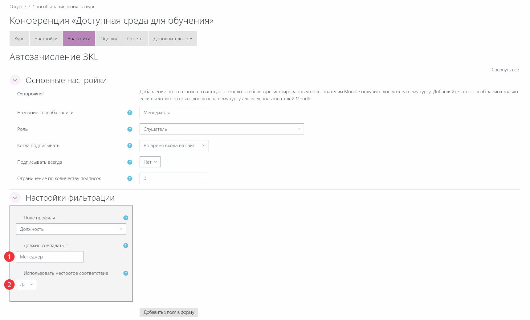 Внимание! Если в качестве фильтрации будет указано только одно «Поле профиля» с пустым значением, то все пользователи системы будут подписаны в этот курс!