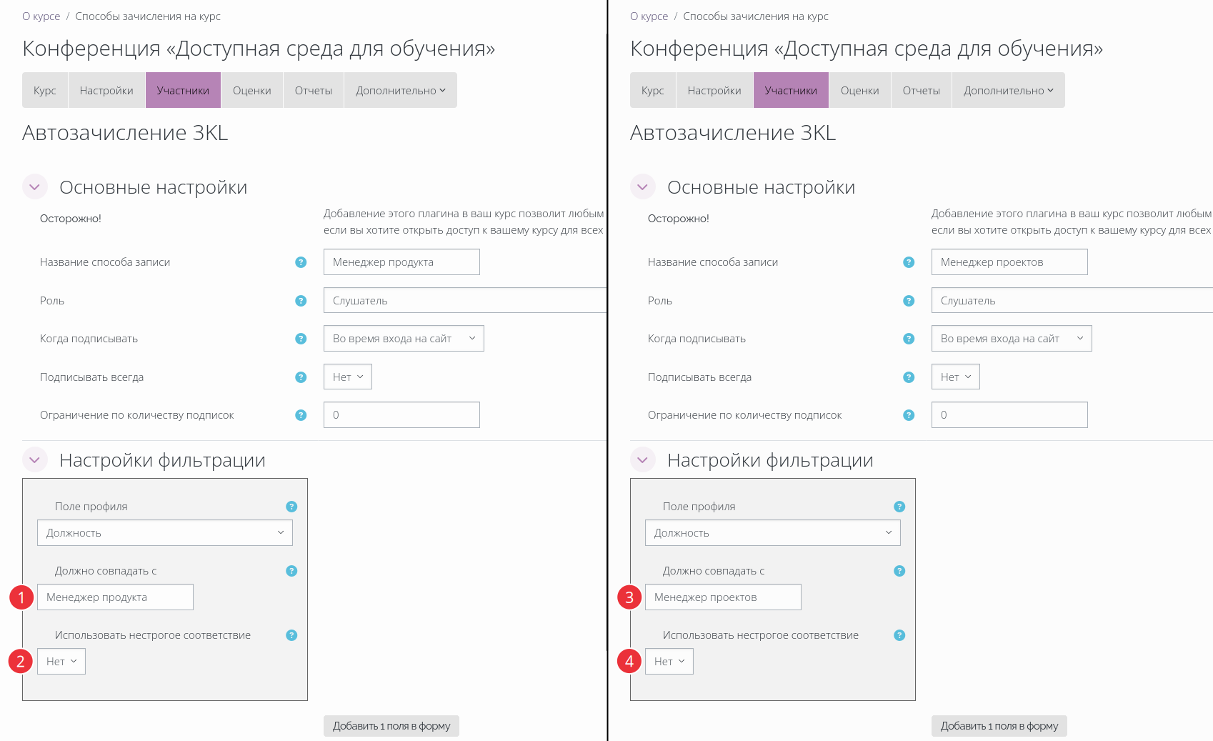 2. Настроить два способа зачисления «Автозачисление 3KL»: в одном указать фильтр по полю профиля «Должность» со значением «Менеджер продукта» (поз. 1 Рис. 4.2.1.б), а в другом – со значением «Менеджер проектов» (поз. 3 Рис. 4.2.1.б). В этом случае не нужно включать нестрогое соответствие фильтру (поз. 2, 4 Рис. 4.2.1.б). Этот вариант подойдет, если в системе есть и другие «Менеджеры», которых не предполагается зачислять на курс.
