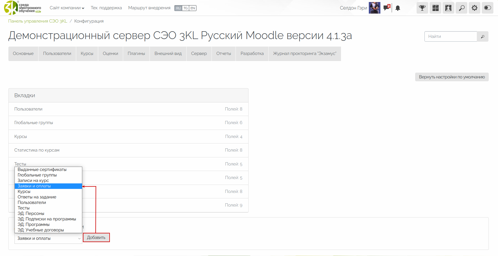 Добавление вкладки «Заявки и оплаты» в панель управления СЭО 3KL