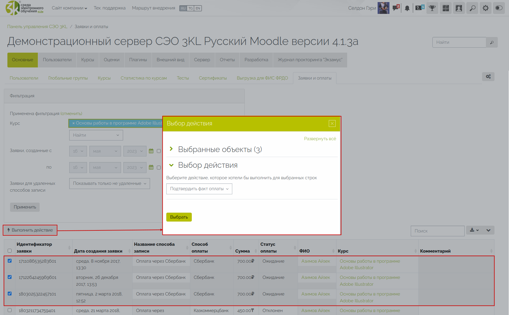 Пример массовых действий со списком заявок и платежей: подтверждение оплат