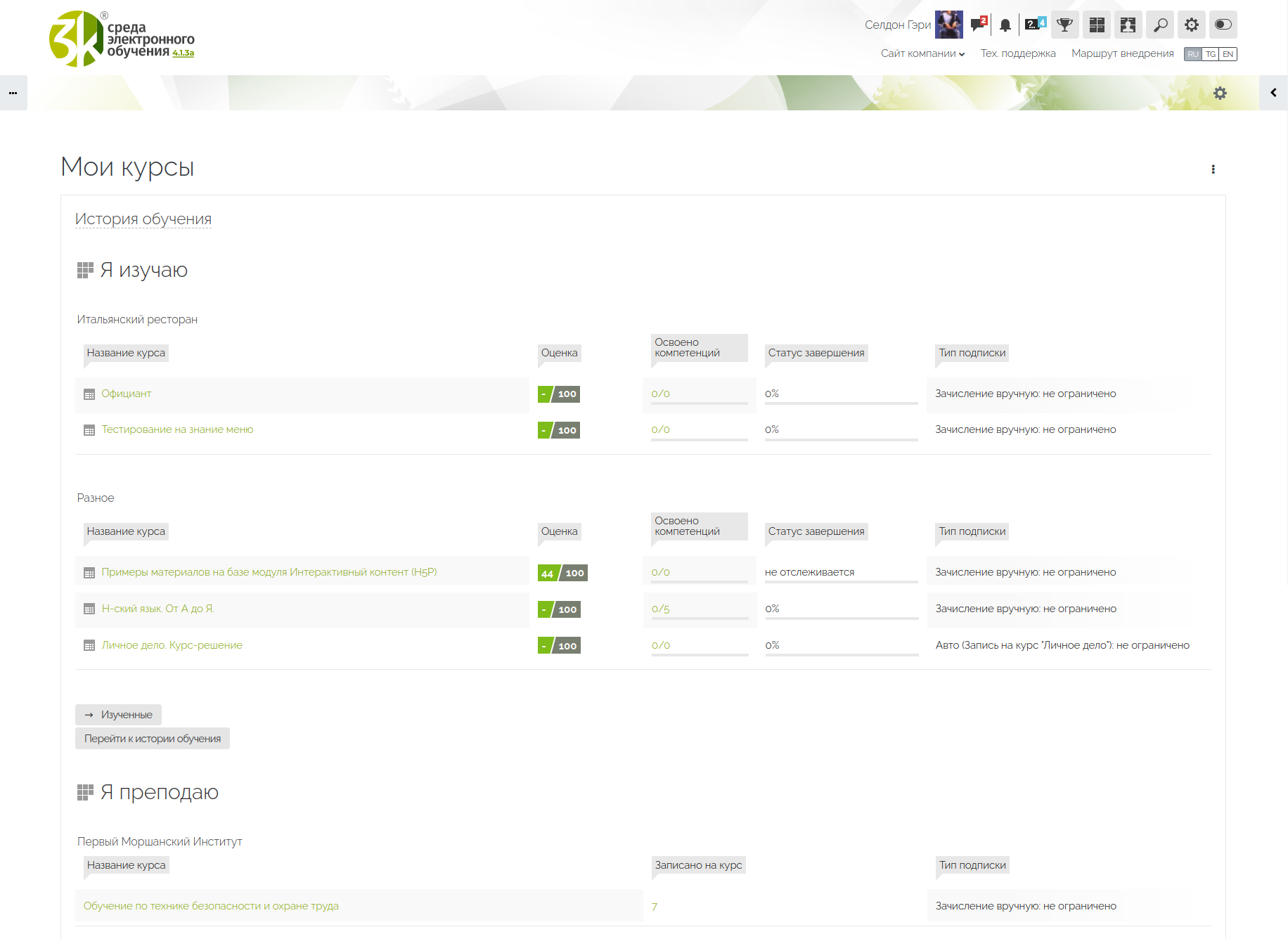 На странице «Мои курсы» появилась возможность отображения блока «История обучения» вместо блока «Сводка по курсам». #4623