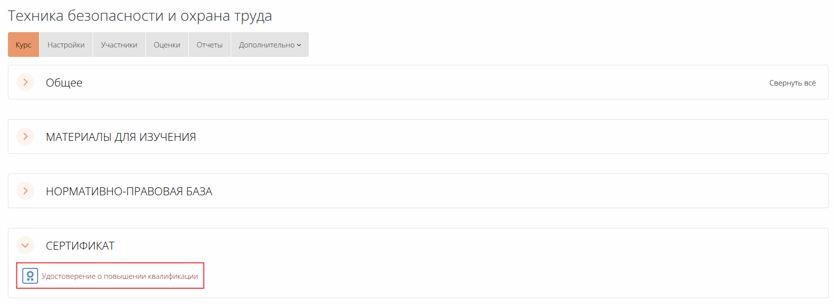 Рис. 2.1.1. Главная страница курса с элементом курса «Сертификат СЭО 3KL».