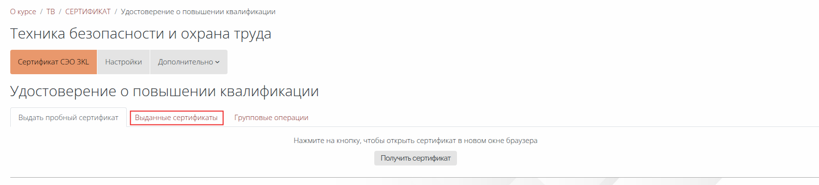Чтобы попасть во вкладку «Выданные сертификаты», пользователю нужно зайти в элемент курса «Сертификат СЭО 3KL» (Рис. 2.1.1) и нажать на соответствующее название в перечне вкладок (Рис. 2.1.2).