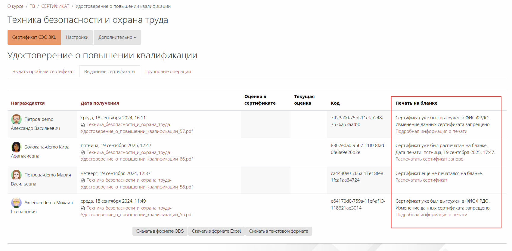 Рис. 2.1.4. Содержимое вкладки «Выданные сертификаты» элемента курса «Сертификат СЭО 3KL». Колонка «Печать на бланке».