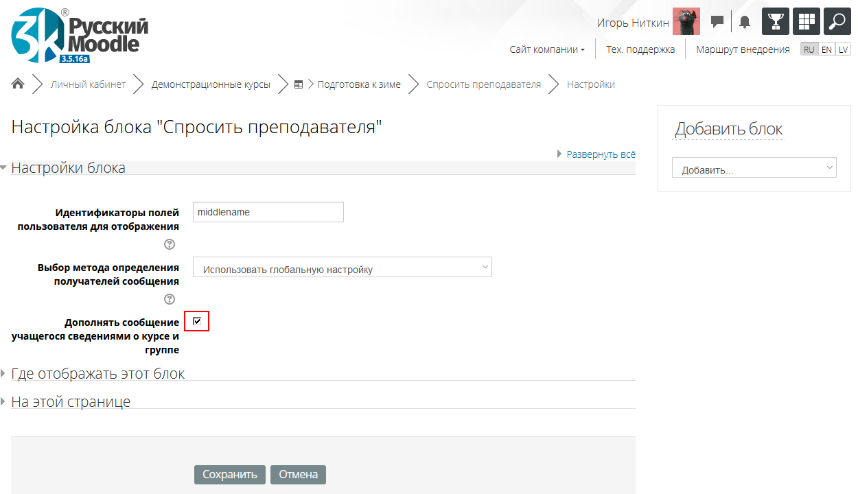 В блоке «Спросить преподавателя» к сообщениям от слушателя появилась возможность добавить подпись. В подписи указывается название и ссылка на курс, из которого отправлено сообщение и перечисляются локальные группы курса, в которых состоит слушатель. Опция включается в настройках блока (выключена по умолчанию). #2496