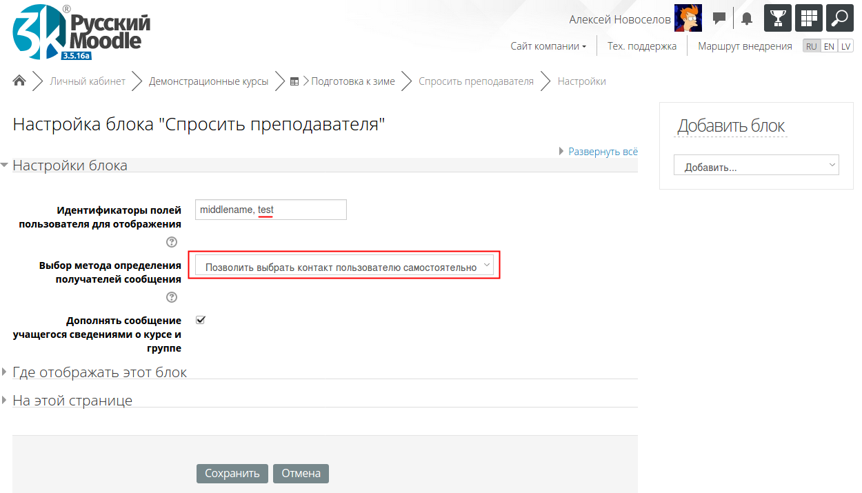 В блоке «Спросить преподавателя» появилась возможность выбрать метод определения получателей сообщения. В зависимости от настройки блока, слушатель сможет отправлять сообщение
