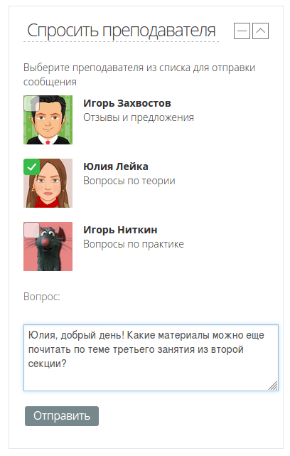 Блок Спросить преподавателя. Отправка сообщения контакту по выбору слушателя