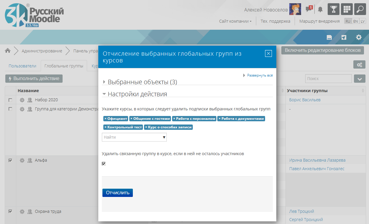 Панель управления СЭО 3KL. Выбор массового действия по отчислению глобальных групп
