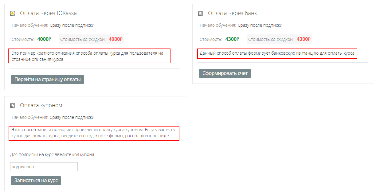 В плагине платной подписки «OT PAY» появилась возможность отображать на странице описания курса значение поля «Краткое описание для пользователя» для каждого способа оплаты.