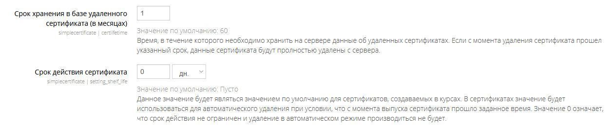 В плагине «Простой сертификат» появилась возможность локальной настройки срока действия сертификата, определяющей условия автоматического удаления просроченных сертификатов. По умолчанию при добавлении элемента «Простой сертификат» в курс устанавливается неограниченный срок действия.