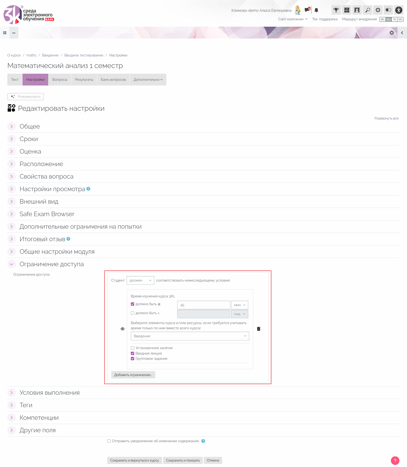 Преподавателю курсов ДПО необходимо предоставлять слушателям доступ к тестированию на курсе только после того, как они затратят указанное время на изучение теоретических материалов курса. Преподаватель использует для этой цели ограничение доступа «Время изучения курса 3KL», однако раньше, используя это ограничение доступа, можно было учитывать только суммарное время, проведенное слушателями во всех элементах курса и ресурсах. С новой доработкой преподаватель сможет самостоятельно определить набор тех элементов курса и ресурсов, суммарное время изучения которых будет учитываться при предоставлении доступа к тестированию, и выбрать только теоретические материалы, необходимые для изучения.