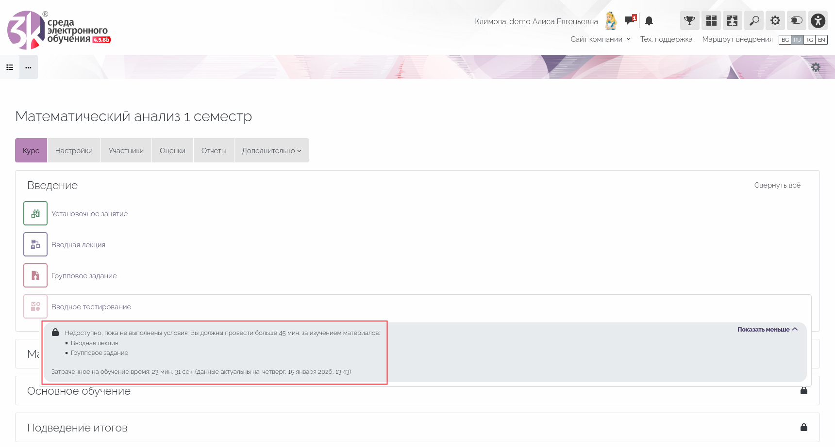 Отображение ограничения доступа «Время изучения курса 3KL» для слушателя в курсе