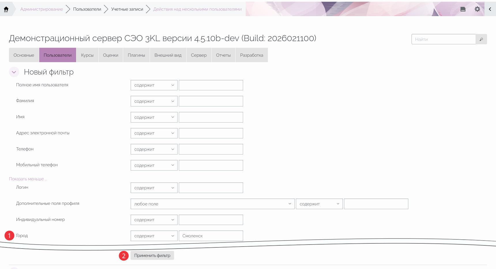 Для формирования такого списка администратор сначала отбирает пользователей, в поле профиля «Город» которых указано значение «Смоленск», указав это значение в строке нужного фильтра (поз. 1 Рис. 1), затем нажимает на кнопку «Применить фильтр» (поз. 2 Рис. 1).