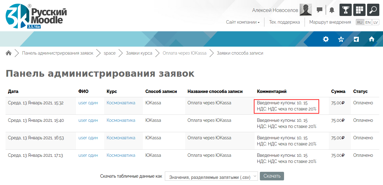 в Панели администрирования заявок в строке платежа теперь отображаются величина НДС и коды скидочных купонов.