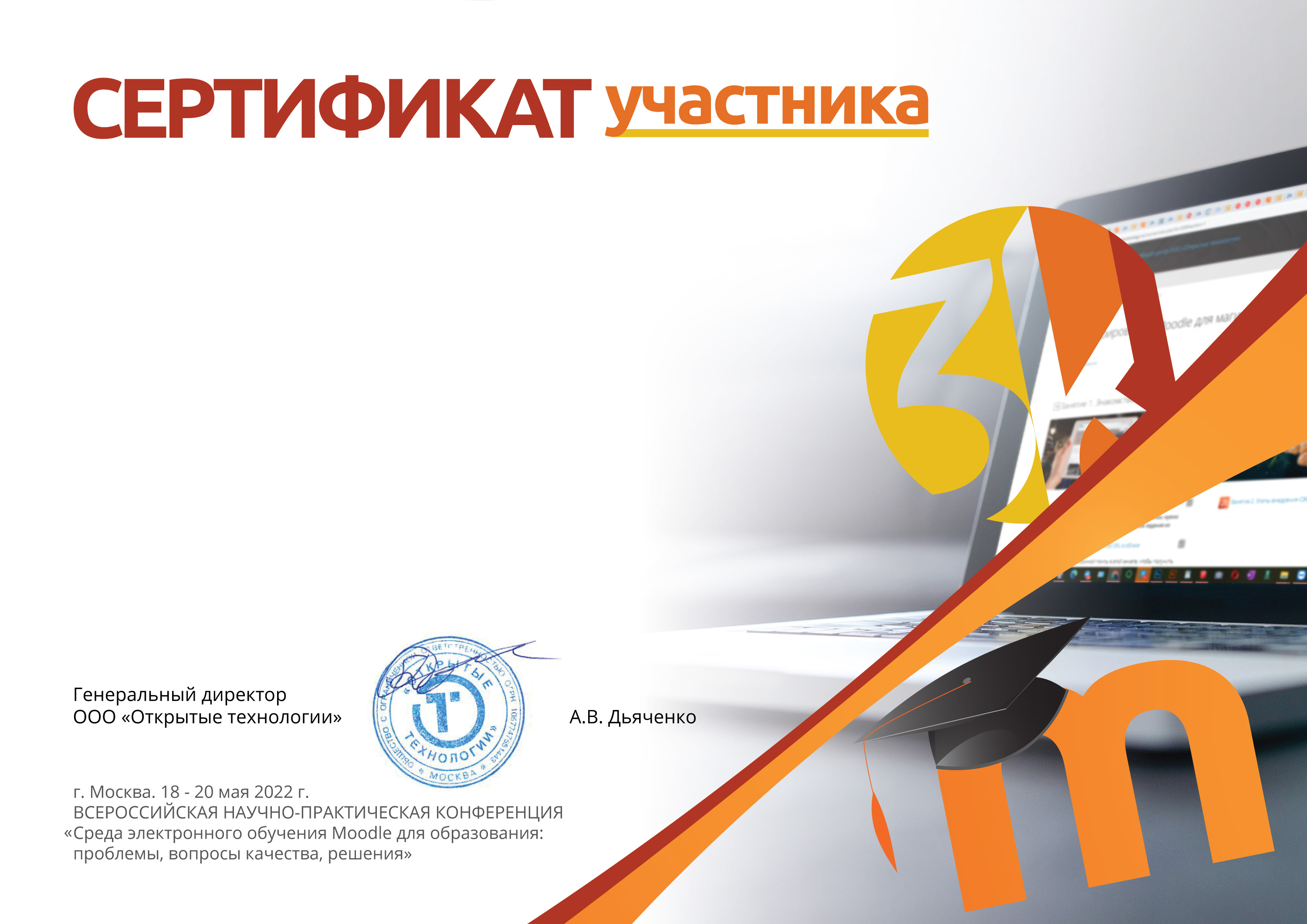 8) Для получения сертификата участника пользователь должен посетить не менее трех докладов в каждый день конференции. Под посещением доклада подразумевается, что в период проведения доклада пользователь находился на этом дистанционном мероприятии (в сессии занятия) и провел там не менее 60% общего времени доклада. Сертификат участника должен соответствовать утвержденному шаблону, формироваться автоматически при достижении условий выдачи и предусматривать возможность выбора участником одного из вариантов оформления: без указания должности участника; с указанием должности участника; с указанием должности участника и количеством посещенных им докладов конференции.